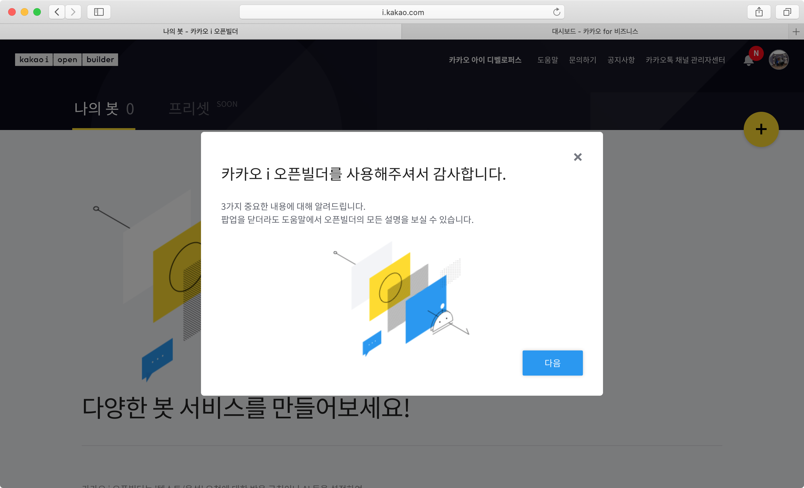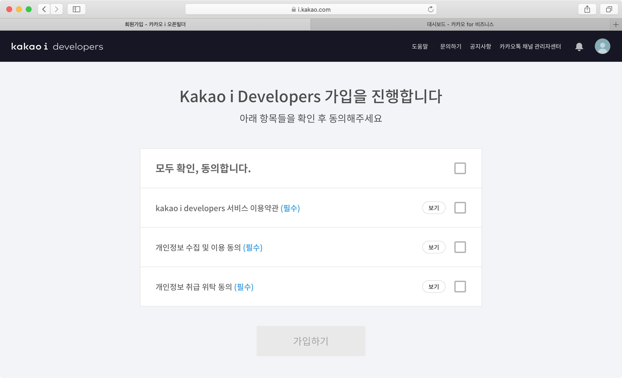 OBT 승인이 끝나고 Kakao i Open builder의 챗봇 만들기 문을 다시 두드리면, Kakao i Developers 가입을 또 진행해야 한다.