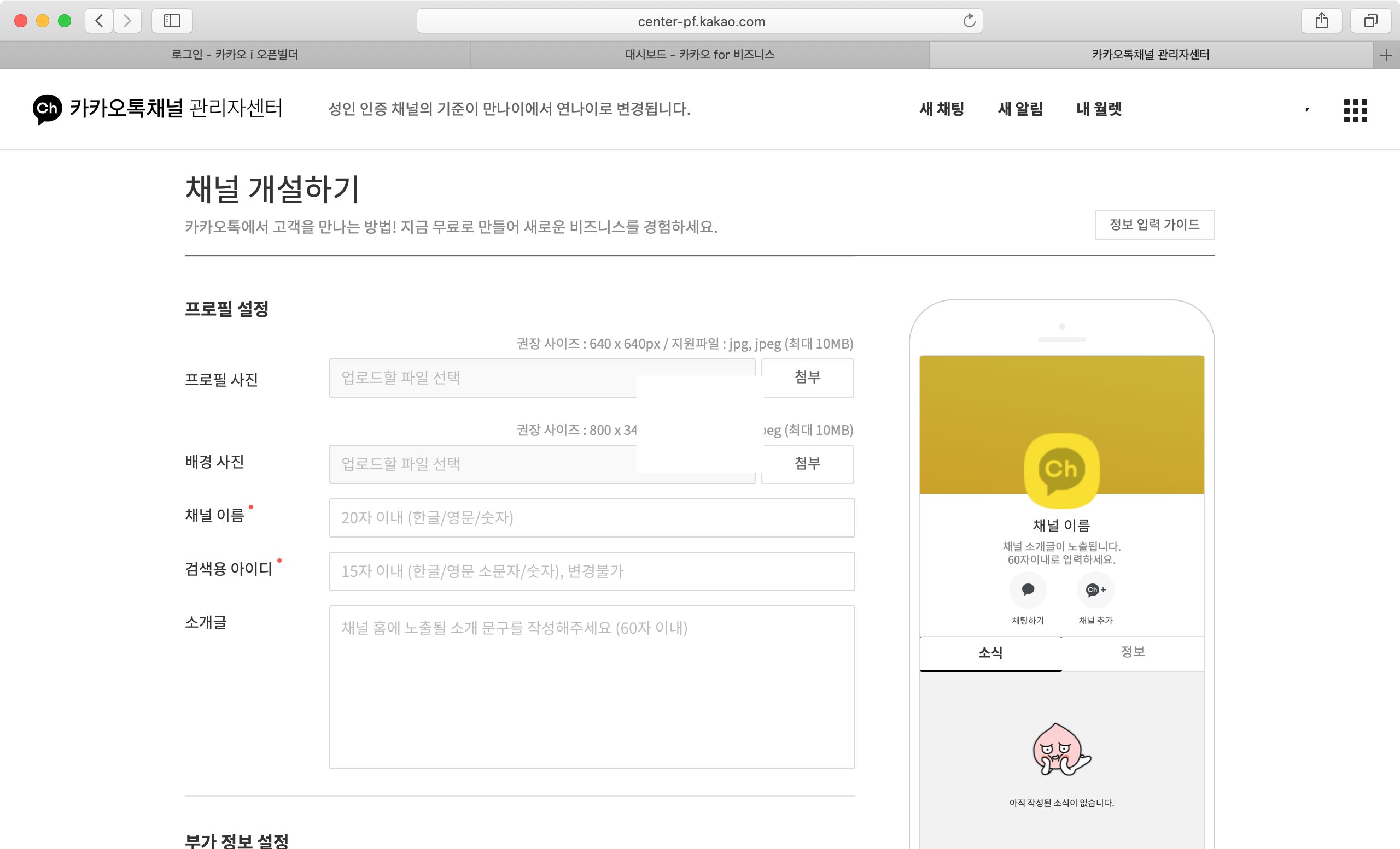 채널 개설하기를 눌러 채널을 하나 만든다. 이 과정은 보조계정을 하나 만드는 것과 비슷하다. 채널로 사용할 이름과 아이디를 만들어주면 채널 생성은 간단하게 끝난다.