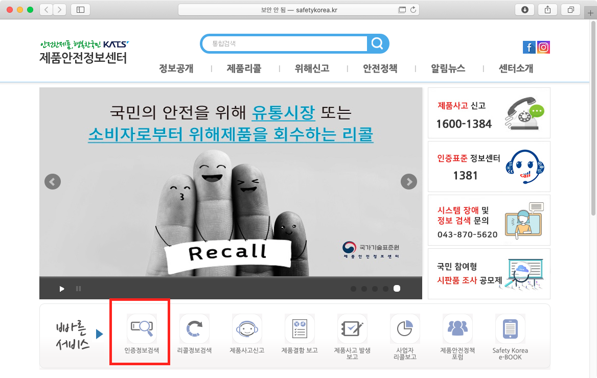 제품안전정보센터(http://www.safetykorea.kr)에 접속하여, 화면 가운데 빠른서비스 중에 "인증정보검색"을 선택한다.