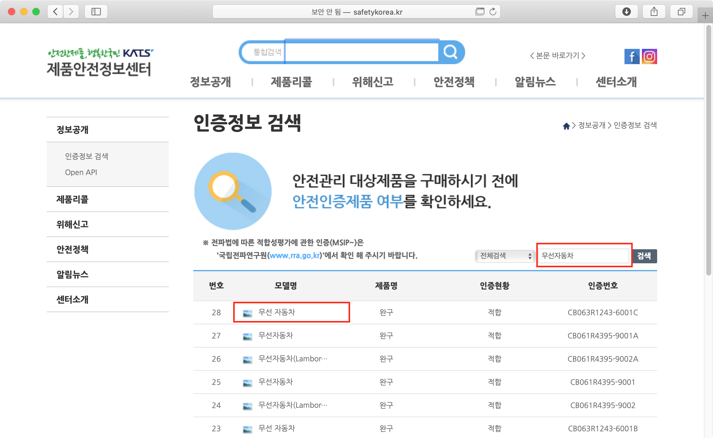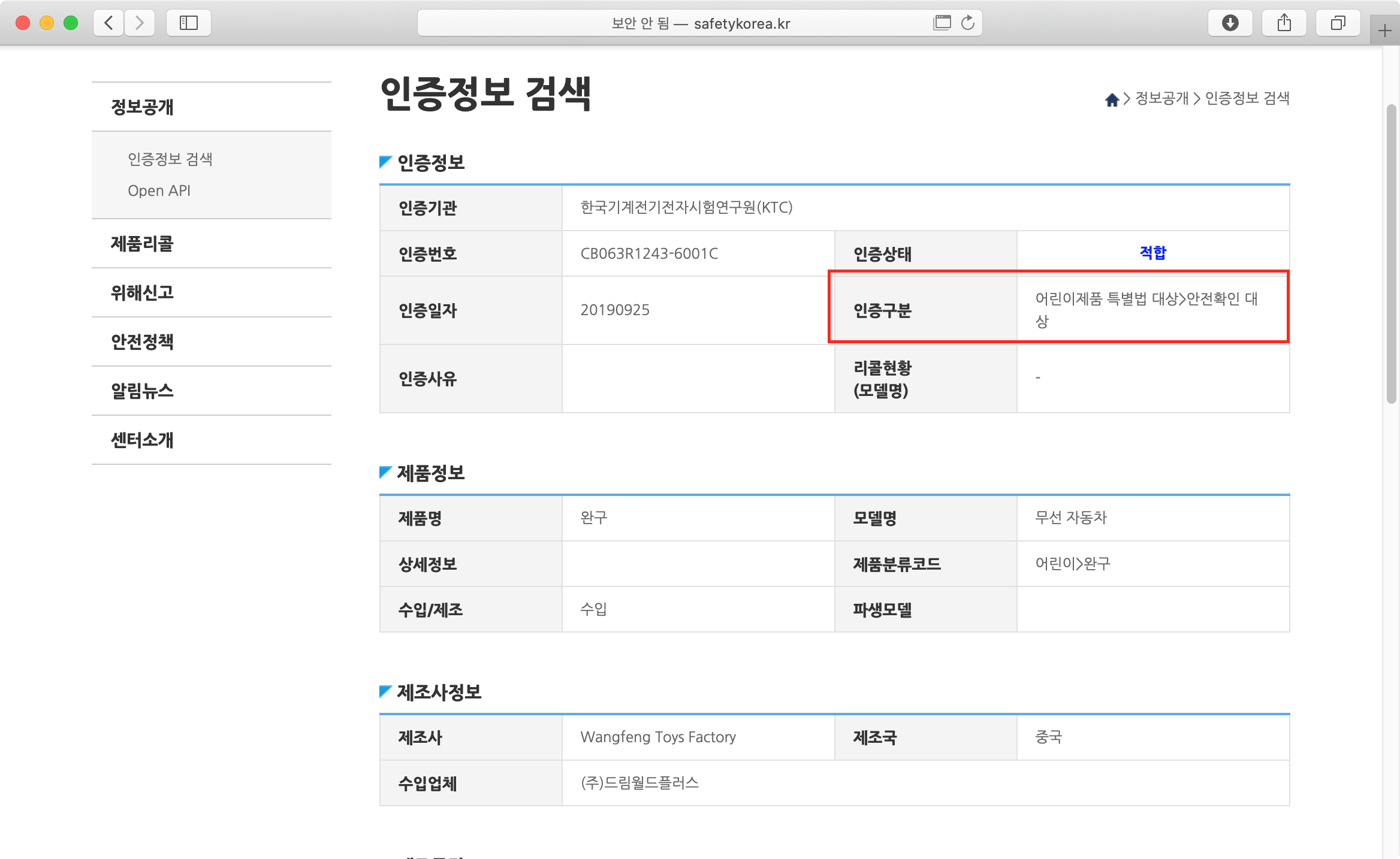 상세페이지에서 인증구분을 보면 완구용 무선 조정 자동차는 어린이제품 특별법에 따라 "안전확인대상"이다.