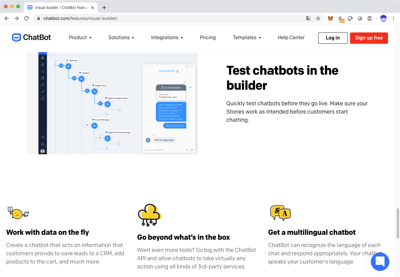 일단, 사이트 도메인이 chatbot.com이라는 점이 놀랍다. 가장 큰 특징은 챗봇을 구축하는 과정이 Work flow를 그리듯 시각화되어 있어, 챗봇을 만들기 편리하다는 것이다. 마케팅, 고객지원, 영업, 교육에 특화되어 있으며, Chat Widget, LiveChat, Facebook Messenger, Slack, WordPress, Zpier와 연동할 수 있다.