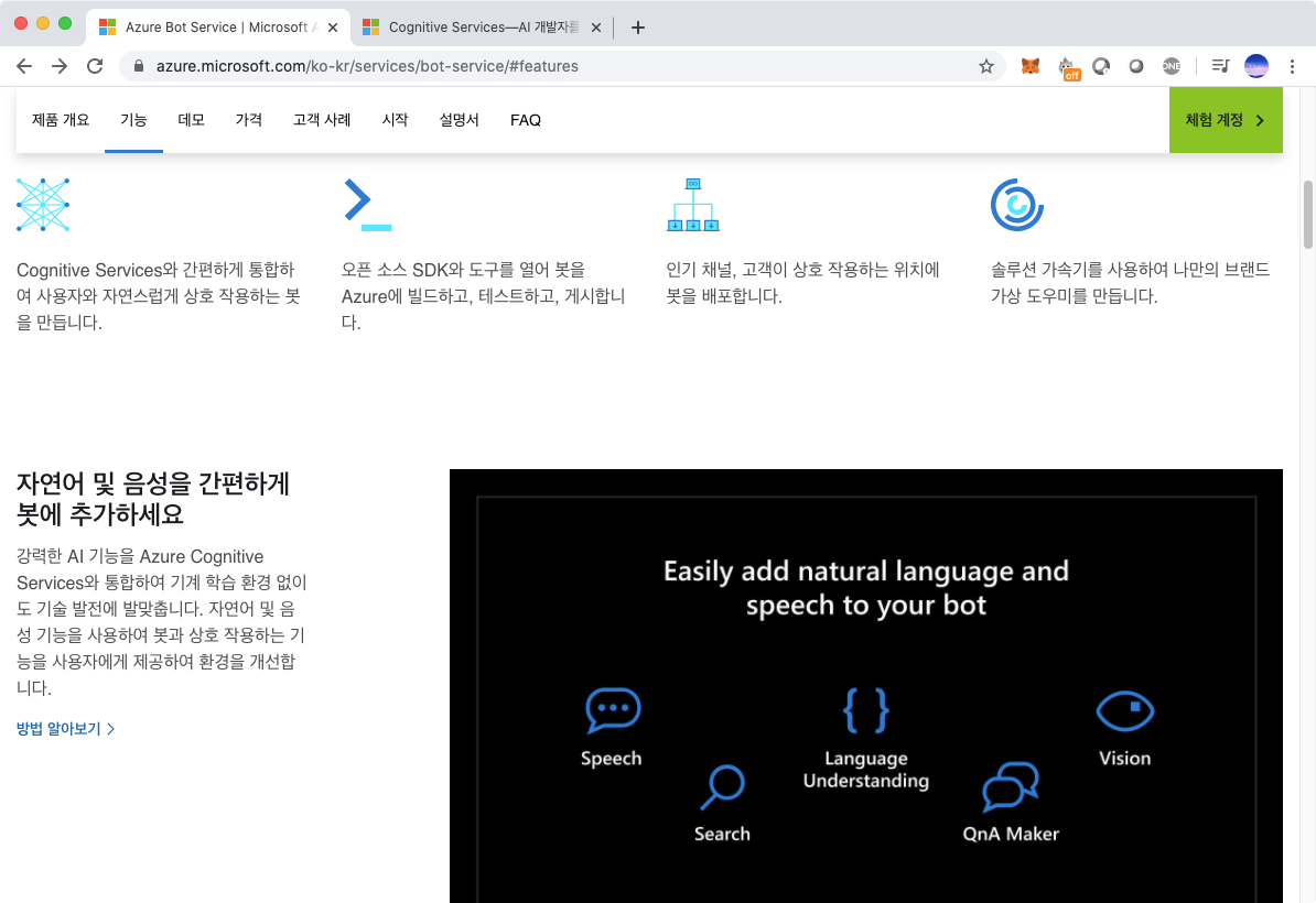기업용 SW의 강자인 MS에서 만든 챗봇서비스 이다. MS의 인공지능 Cognitive Services와 통합되어 음성인식, 영상인식 등 다양한 기능 확장이 가능할 뿐만 아니라 60개가 넘는 언어를 지원한다. 다른 챗봇들이 대부분 파이선이나 자바스크립트를 지원하는 반면 Azure Bot Service는 C#도 지원한다. MS 제품군인 Skype, Teams, Cortana 뿐만 아니라 Alexa, Facebook, Slack, Telegram, WeChat 등 다양한 채널을 지원하며 국내 Line까지도 연동 할 수 있다.