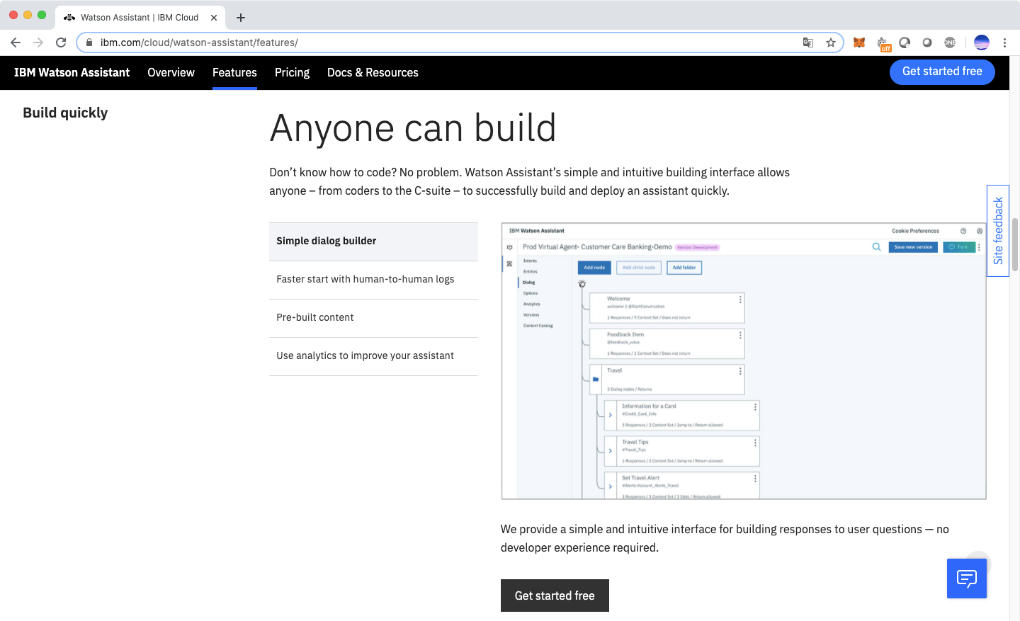 IBM은 인공지능 역사가 깊은 회사이다. 1997년 딥 블루가 체스 세계 챔피언 가리 카스파로프를 이겼고, 2011년에는 미국 인기 퀴즈쇼 재퍼디에서 승리하면서 인공지능의 새장을 열었으며, 의사를 보조하는 인공지능 의사로까지 발전하여 실전배치 돼었다. 이러한 왓슨의 인공지능에 챗봇의 기능이 포함되어 있다. IBM 챗봇은 고객의 질문에 대한 답이 여러 가지로 해석될 때 빠르게 최적의 답을 찾아 제시할 수 있는 것이 특징이다. Salck, Facebook 등 다양한 채널과 연동도 가능하다.