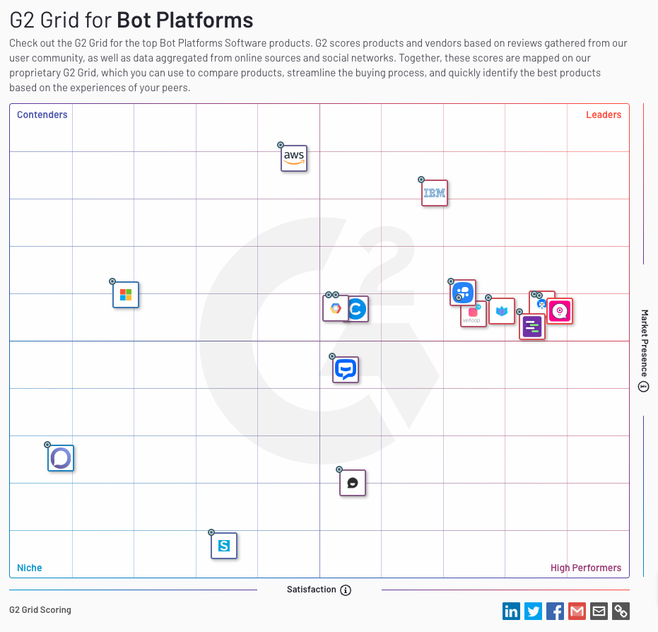https://www.g2.com/categories/bot-platforms Software 비교 사이트 g2.com에 등록된 챗봇 빌더 서비스 업체는 2020년 6월 현재 120여 개에 달하며, 그중 한국어를 지원하는 서비스는 9곳이다. 네이버나 카카오 같은 로컬 서비스는 g2.com 리스트에 포함되어 있지 않으니 실제는 더 많은 챗봇 빌더 회사가 있는 것이다. 시장 점유율 측면에서는 아마존과 IBM이 선두이며 성능 측면에서는 Landbot, TARS 등이 높게 평가되고 있다.