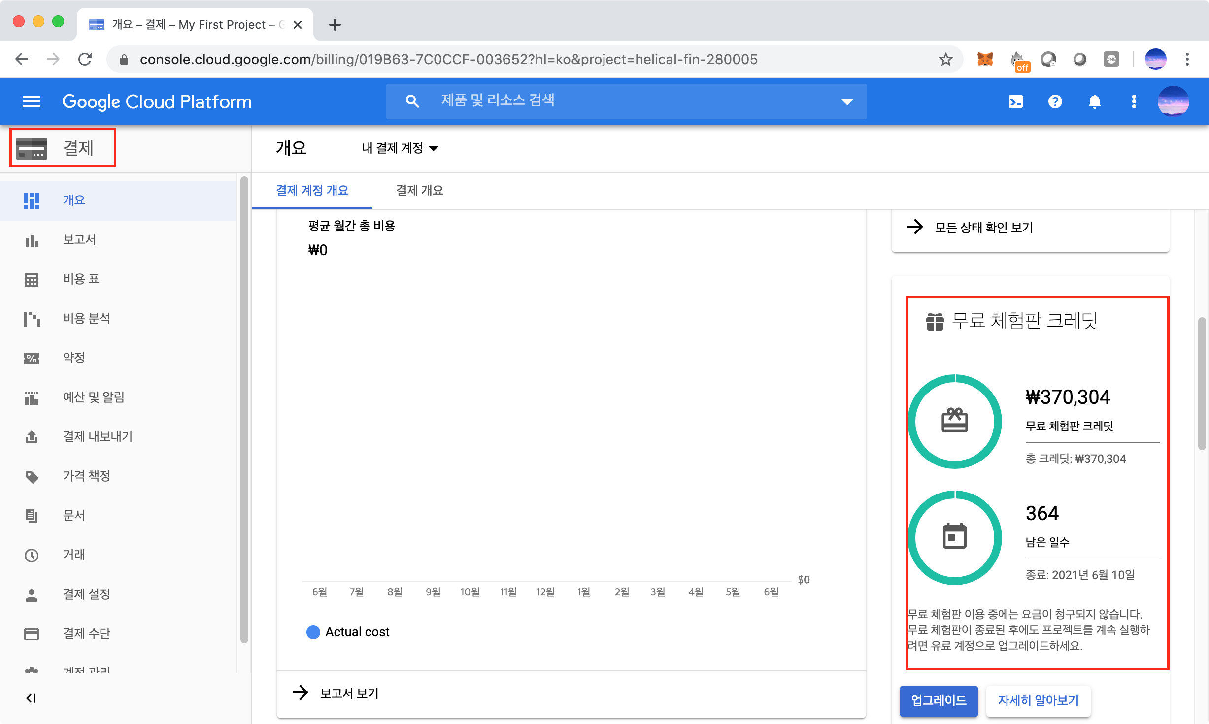 Google Cloud Platform에 접속 후 왼쪽 메뉴에서 "결제"를 선택하면 현재 잔여 크레딧을 확인할 수 있다. 무려 37만원의 무료 크레딧이 생겼는데, 1년내에 사용해야 한다.
