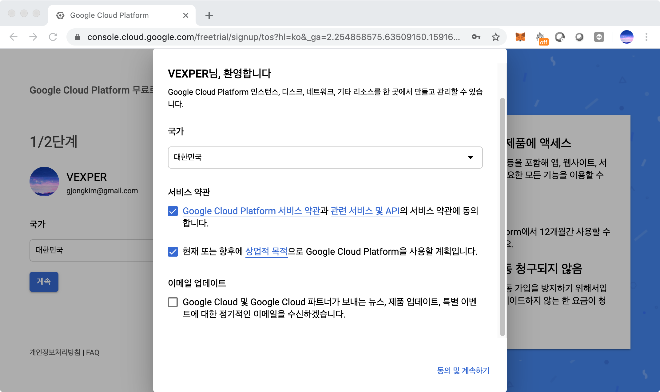 Google Cloud Platform 무료 평가판 서비스 약관에 체크하고 계속 버튼을 눌러 다음 화면으로 넘어간다.