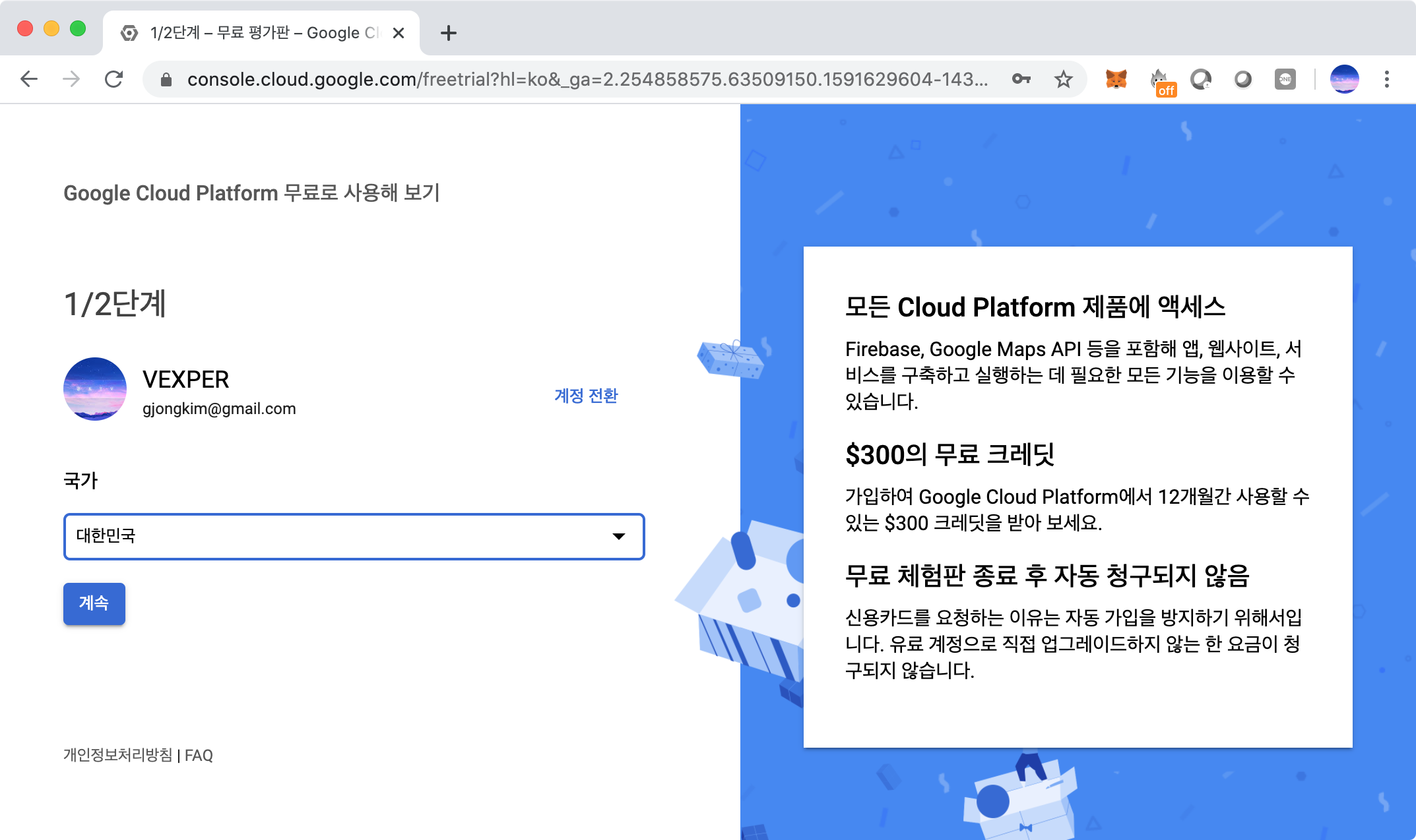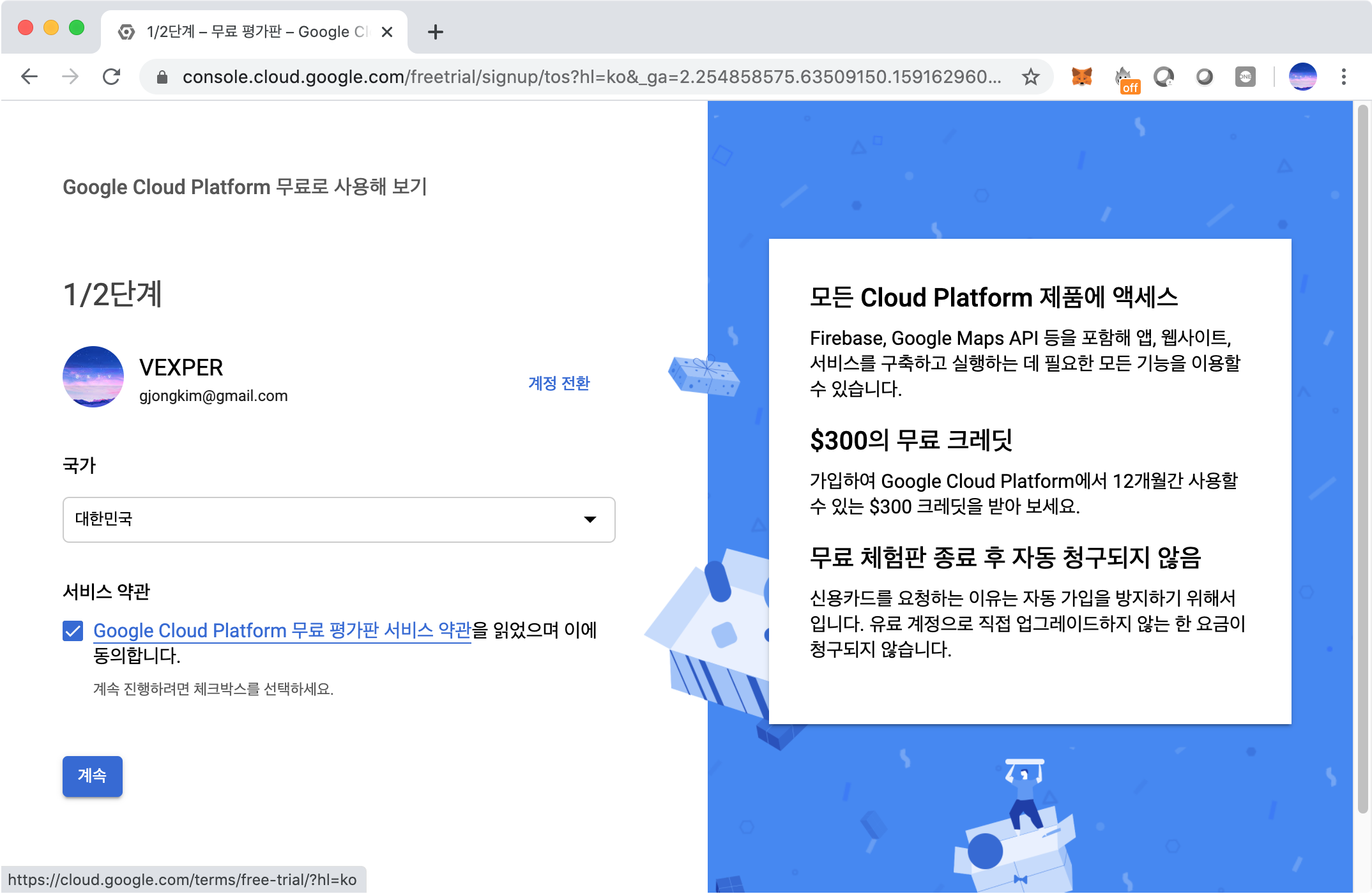 $300 무료 크레딧을 12개월간 사용할 수 있고, 만약 무료체험판이 종료돼도 구독 연장되지 않는다니 깔끔한 God Google이다. "계속"버튼을 눌러 다음 화면으로 이동한다. 계속 버튼을 눌러도 크롬이 멍~ 때리는 경우가 있는데 그럴 때는 새로고침 한번 눌러주면 약관이 나온다.