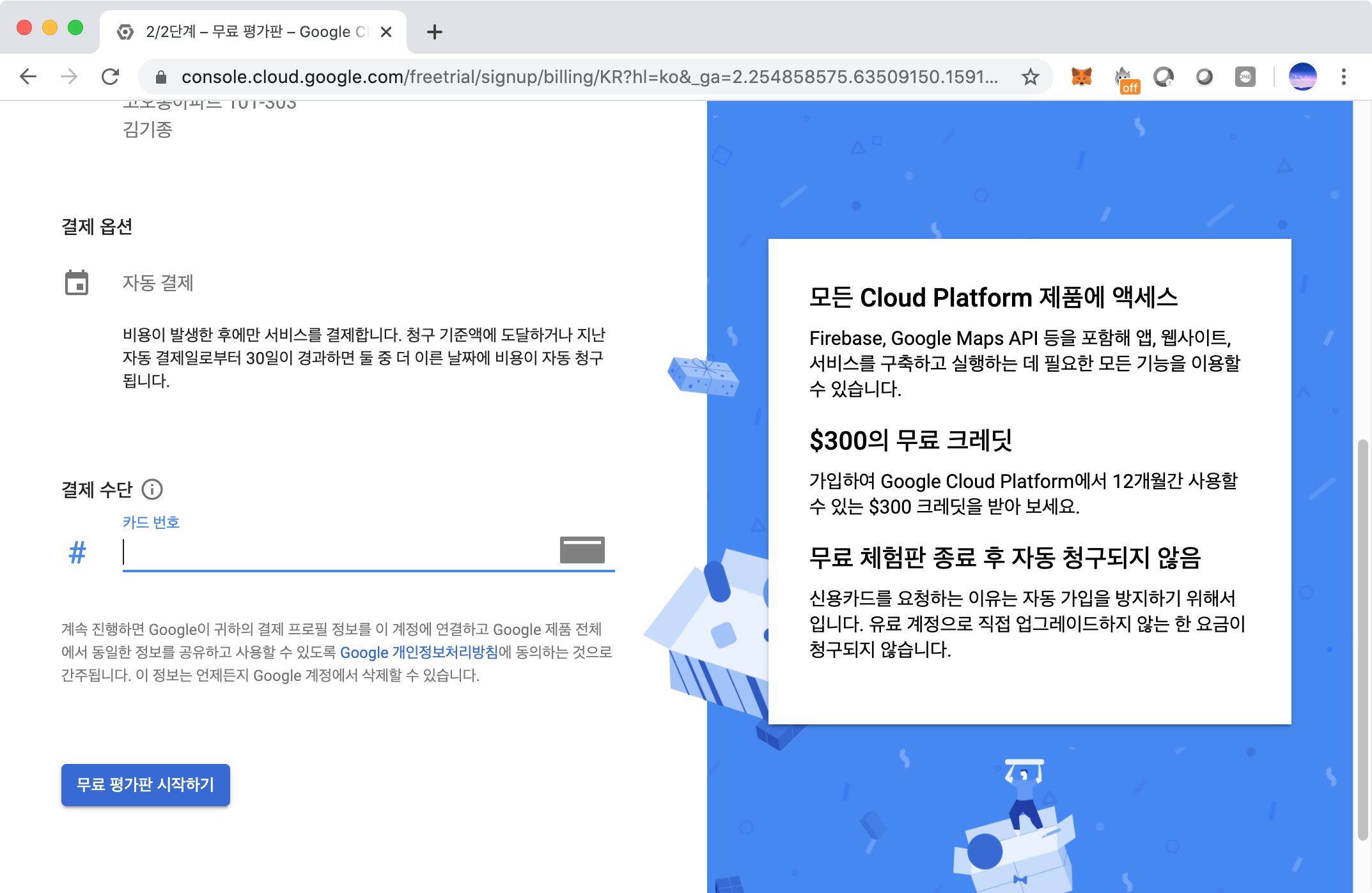마지막 단계로 카드번호를 등록해 준다. 무료 체험판 종료 후 자동청구되지 않는다고 God Google님이 말씀하셨으니 믿고 카드 정보를 넘겨줘 보자.