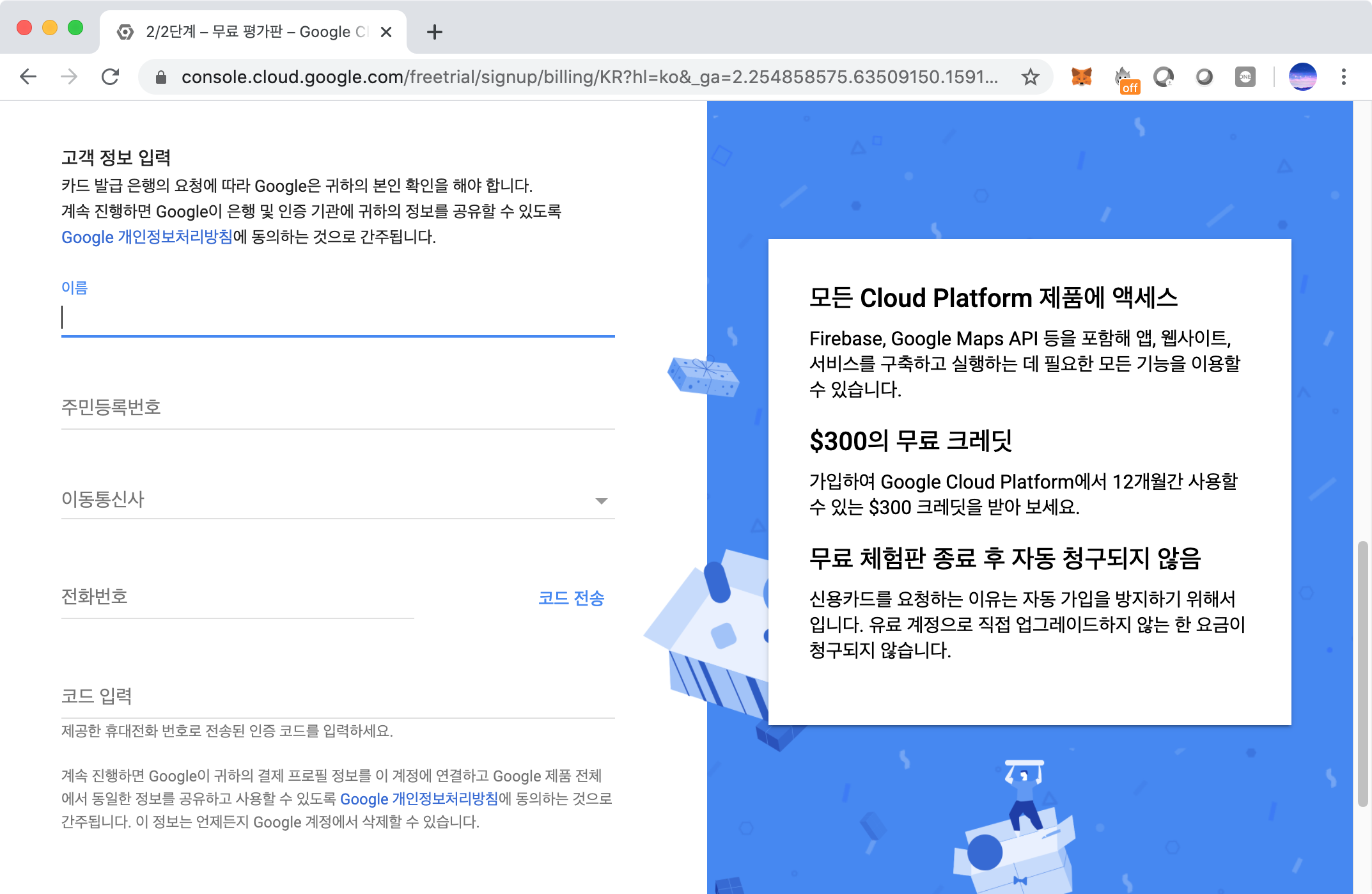 개인정보를 넣어주고, 핸드폰 인증까지 받아야 $300을 받을 수 있다.